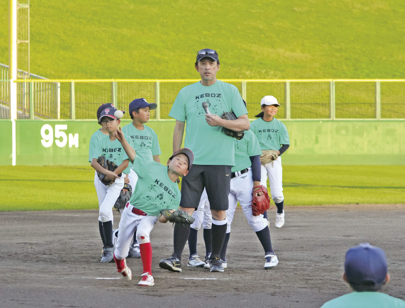 旭川市出身の元プロ野球選手の星野伸之さんと牧谷宇佐美さんによる子ども野球教室が9月5日、スタルヒン球場で開催。地元の野球少年団等に所属している小学4年生60人が参加した。旭川市出身の川村健一さんが経営するアパレルブランドKEBOZからオリジナルTシャツが参加した子どもたちへ提供された。