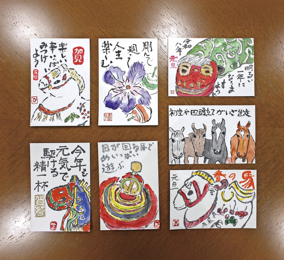 現在は30人の会員が毎月第1土曜13時〜15時、ときわ市民ホールで活動。5月は「子ども」、7月は「暑中見舞」、9月は「果物」など毎月季節の風物詩や、4月の「アイヌ紋様」など、さまざまなテーマで描いています。